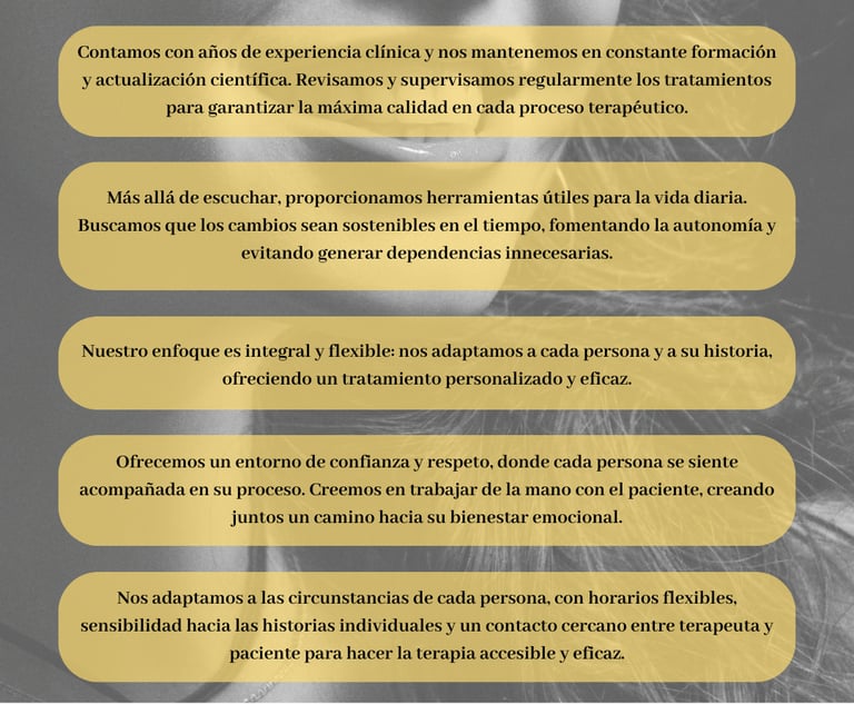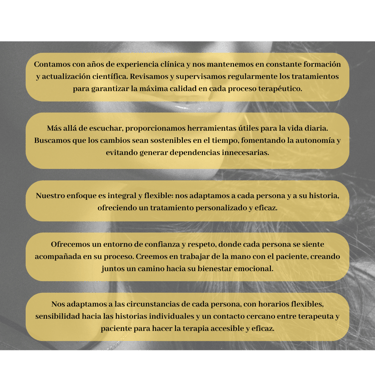 Tratamiento integral y flexible: adaptamos la terapia a cada persona y su historia, con un enfoque personalizado y eficaz.